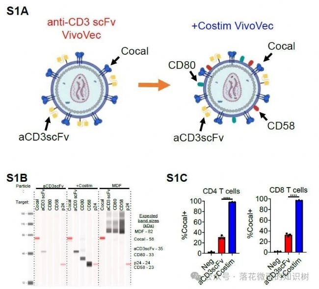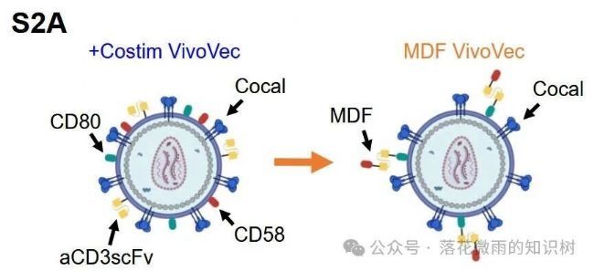 作者設計了一種包含多個結構域的蛋白(MDF):包括CD58、抗CD3 scFv和CD80組成的單鏈長肽。這樣可以簡化VVPs的制備,并且成功將MDF成功展示在病毒表面(S2A)。