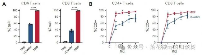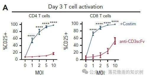 出乎意料的是,與單獨的抗CD3 scFv或含有共刺激分子的病毒顆粒相比,MDF VVPs與T細胞的結合要更多(2A),并導致更高的T細胞CD25表達(2B)。