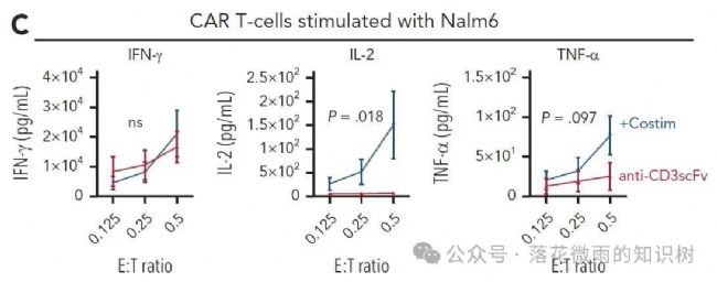 將表達或不表達共刺激分子的VVPs產生的CAR-T細胞分別與Nalm-6細胞以不同的ET比共培養,24小時后,檢測細胞因子的表達。表達共刺激分子的VVPs組的CAR-T細胞比單獨表達抗CD3 scFv的VVPs產生的IFNγ的量相似,但IL2和TNF-α的水平更高(1C)。