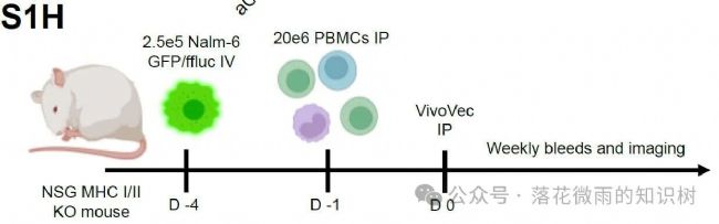 雌性Nod.Cg-PrkdcscidIL2rgtm1Wjl/SzJ小鼠(這個小鼠重度免疫缺陷導致T/B細胞缺失;IL2rg基因敲除缺乏NK細胞;MHC I/II雙敲除)。Day -4,通過 尾靜脈注射 2.5E5個 Nalm6細胞。Day -1,用 IVIS測量小鼠腫瘤負荷。根據腫瘤大小隨機分組,確保組間基線一致。通過腹腔注射2E7個PBMCs。Day 0,腹腔注射攜帶CAR基因的 VivoVec病毒顆粒(劑量根據分組調整),體積200 μL(S1E)。