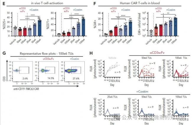 VVP給藥4天后,取小鼠的外周血,通過流式細胞術定量分析人源CD3+ T細胞表面CD25和CD71的表達水平,評估其活化狀態。1E的橫坐標代表的是不同VivoVec病毒顆粒的注射劑量,單位為轉導單位(TU)。與體外研究結果一致,表達帶有共刺激配體的抗CD3 scFv的VVPs比單獨表達抗CD3 scFv的VVPs誘導了更強的T細胞活化,且呈劑量依賴性。VVP給藥11天后檢測外周血中CAR-T細胞頻率。用含共刺激配體的抗CD3 scFv的VVPs處理的動物顯示出更多的CAR-T細胞數量(1F-G)。最后,對腫瘤負荷進行評估,使用共刺激配體表達抗CD3 scFv的VVPs治療,在VivoVec病毒顆粒較低劑量下腫瘤抑制作用就很強了(1H)。