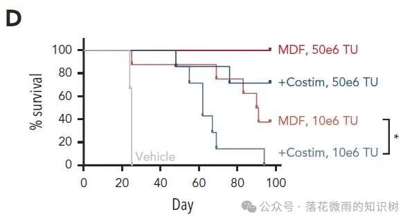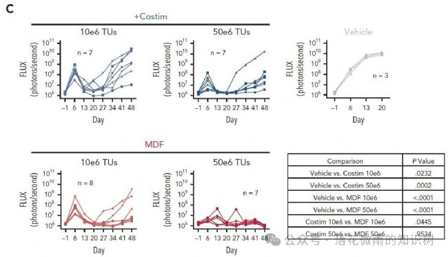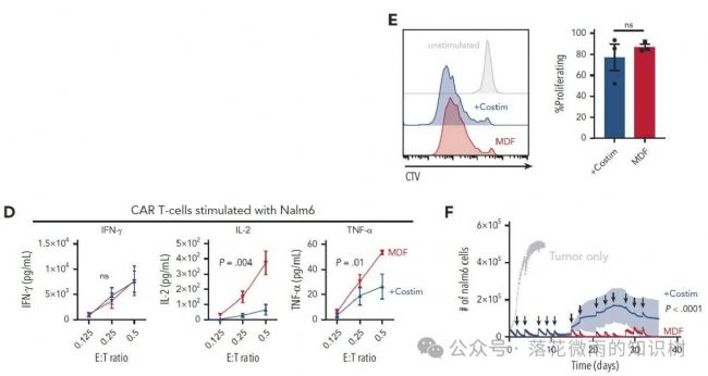 接下來就是,與表達共刺激分子的VVPs組相比,MDF VVP產生的抗CD19 CAR-T細胞在與Nalm6細胞共培養時,CAR-T細胞擴增的量差不多(2E),IFNγ產生量差不多(2D),但產生更多的IL-2和TNF-α(2D),提示MDF VVP產生的CAR-T細胞可能具有更好的功能性。在連續刺激實驗中,MDF VVP產生的CAR-T細胞能夠更好地控制Nalm6腫瘤的生長(2F)。