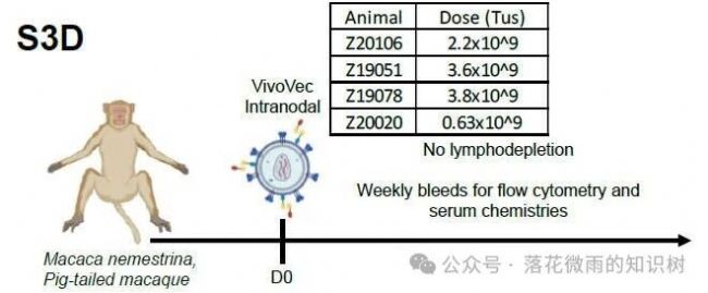 該實驗將編碼抗CD20 CAR的VivoVec載體顆粒(VVPs)直接注射到豬尾獼猴的淋巴結內(最多4個,每處≤1mL)。每日監測,記錄動物的體溫、活動狀態、食欲、糞便情況和整體健康狀況。實驗嚴格遵守動物倫理規范,每日監測動物生理狀態,并在特定時間點采血進行流式分析(檢測CAR T細胞生成、免疫細胞表型等)、DNA檢測(用于后續的生物分布檢測,如ddPCR檢測載體基因組)及臨床生化檢驗(監測血常規、生化指標等,評估潛在毒性或副作用,如CRS相關指標CRP、IL-6、鐵蛋白、肝酶ALT/AST等),以評估體內CAR T細胞的生成、功能、B細胞清除效果以及安全性。對出現CRS/ICANS跡象的動物,按方案使用了托珠單抗、阿那白滯素、地西泮進行治療,其中一只動物還使用了地塞米松。