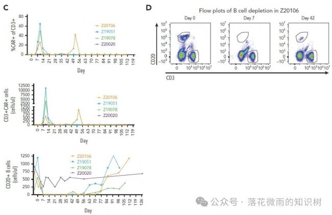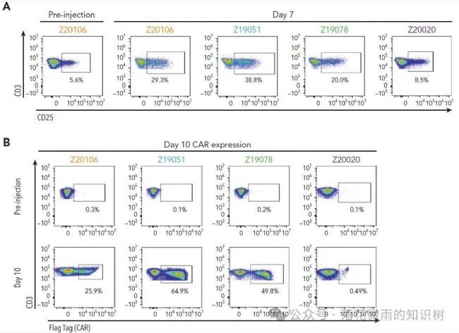 給藥后7天,4只動物中有3只觀察到NHP MDF VVP誘導的T細胞活化(4A)。在這3只動物中,NHP MDF VVP給藥效果顯著,在第10天產生的CAR T細胞占循環T細胞的比例高達65% (4B),相當于每微升血液中含有5963875和11182個CAR-T細胞。低劑量組的Z20020, 作者沒有觀察到明顯的T細胞活化,CAR的表達,也沒有觀察到B細胞的消除。