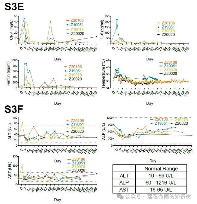 在CRS方面,作者在血液(S3E)中檢測到,CAR-T細胞產生的前不久就會觀察到C反應蛋白(CRP)水平升高,這表明這是CAR-T細胞介導的,而不是病毒顆粒導致的。這是短暫的,隨著CAR-T細胞在第14天從血液中消失,CRP水平正常化。如上所述,1只動物在第49天經歷了血液CAR-T細胞的回升(4C),這也再次伴隨著CRP的短暫升高。IL-6,鐵蛋白和溫度遵循類似的規律。除了CRS癥狀,作者在前2只動物中觀察到輕微的震顫和短暫的癲癇。這些事件是短暫的,與第10天觀察到的CAR-T細胞擴增峰值相吻合。給予托珠單抗和阿那白滯素治療后震顫消失。作者沒有觀察到任何明顯的肝臟毒性的跡象,與谷丙轉氨酶,谷草轉氨酶,堿性磷酸酶仍然保持在正常水平,除1只動物的谷丙轉氨酶和谷草轉氨酶在第1天出現短暫輕度升高外(S3F)。