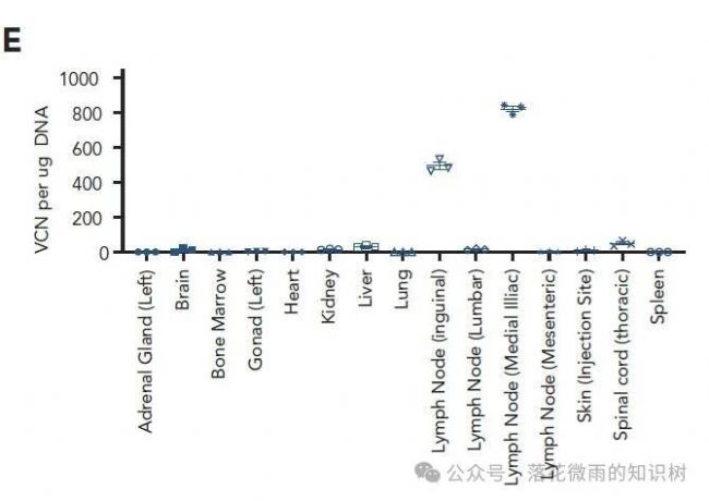 取VVP治療最長時間(139天)的1只動物進行剖檢,20種不同組織通過ddPCR評估載體基因組整合。在注射的部位inguinal lymph node和緊接著的medial iliac lymph node可以檢測到抗CD20 CAR轉基因。但是在其它組織中并沒有檢測到,這表明在VivoVec處理后,轉基因細胞主要被隔離在注射和鄰近的淋巴結中幾個月(4E)。