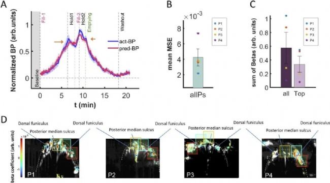 利用線性支持向量機回歸模型(SVM-r) 基于 fUS 信號準確重建膀胱壓力變化,識別出關鍵脊髓區域。該研究首次在人類中證實脊髓存在膀胱壓力響應區域,為理解排尿控制機制、開發脊髓 - 機器接口及優化神經調節治療奠定基礎。