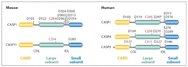 N端是由caspase激活和招募結構域(CARD)組成,使其能夠被招募到炎癥小體;催化結構域是由大亞基(P17-20)、小亞基(P10-12)及連接大小亞基的連接區(IDL)組成;CARD通過一個CARD域連接子(CDL)與蛋白酶域相連。
