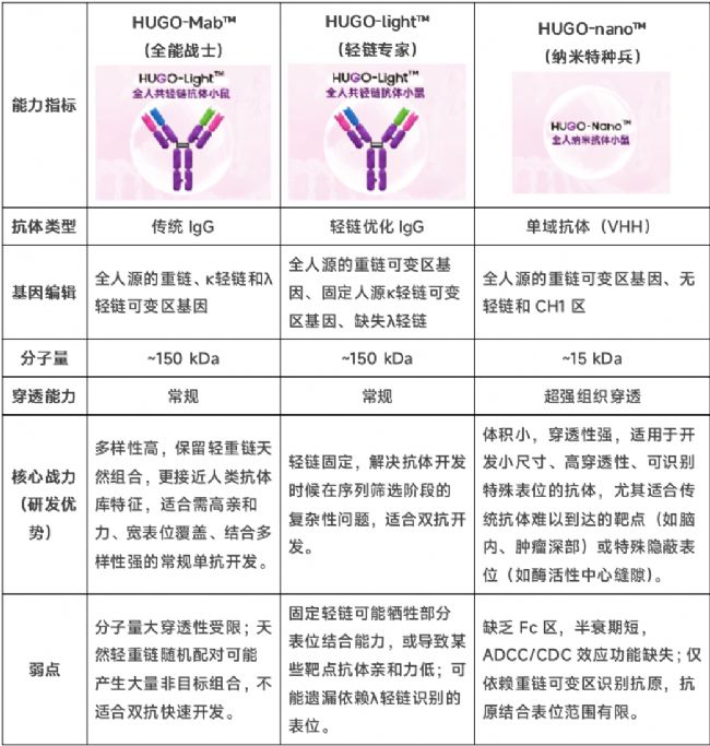 HUGO-MabTM、HUGO-LightTM和 HUGO-NanoTM小鼠模型各有千秋,在抗體藥物研發中扮演著不同但至關重要的角色。通過精準把握研發目標和靶點特性,選對 “英雄” 才能在抗體藥物的研發戰場上事半功倍。