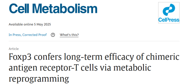 [1]Congyi Niu, Huan Wei, Xuanxuan Pan, Yuedi Wang, Huan Song, Congwen Li, Jingbo Qie, Jiawen Qian, Shaocong Mo, Wanwei Zheng, Kameina Zhuma, Zixin Lv, Yiyuan Gao, Dan Zhang, Hui Yang, Ronghua Liu, Luman Wang, Wenwei Tu, Jie Liu, Yiwei Chu, Feifei Luo,Foxp3 confers long-term efficacy of chimeric antigen receptor-T cells via metabolic reprogramming, Cell Metabolism, Volume 37, Issue 6,2025, Pages 1426-1441.e7,ISSN 1550-4131, https://doi.org/10.1016/j.cmet.2025.04.008.