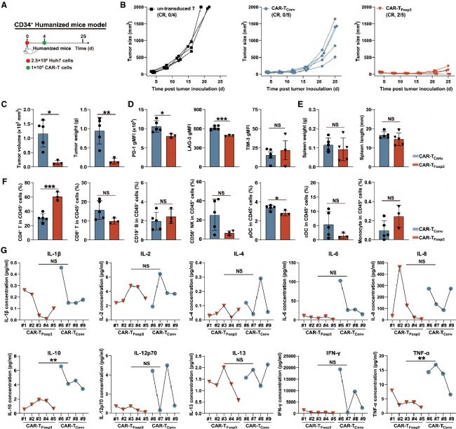 3. CAR-TFoxp3細(xì)胞在人源化C-NKG模型中獲得強(qiáng)大抗腫瘤活性且無(wú)免疫抑制: