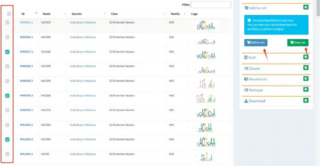 2.選擇motif:從搜索結果中挑選出感興趣的motif,點擊“Add to cart”,完成后點擊“View cart”進入分析界面。
