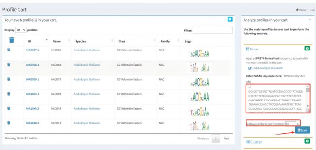 3.輸入序列,設置參數:在紅框區域輸入待測序列(常見為基因轉錄起始位點TSS上游2000bp的啟動子區域,可含TSS下游200-500bp),需為標準fasta格式,匹配閾值默認是80%,該值代表預測結合位點與數據庫中已知motif的序列相似性閾值,若需提高預測的嚴格性,可將閾值調整為85%,設置完成后點擊“Scan”啟動分析。