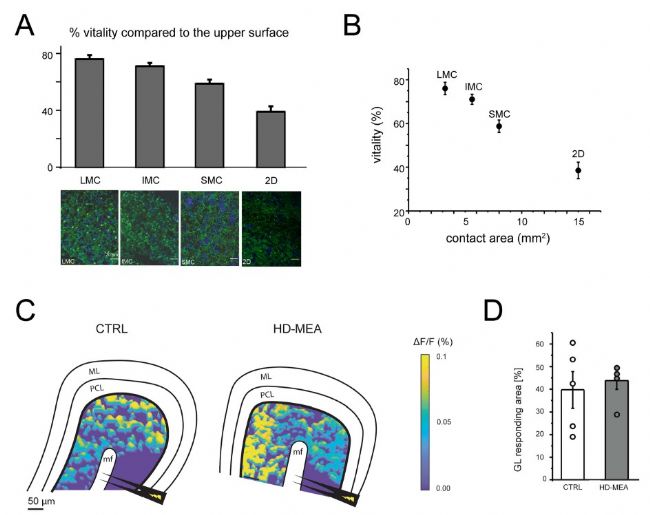 圖3. 平面和3D高分辨微電極陣列(HD-MEA)上小腦切片的組織活力和神經活性。A)直方圖顯示了在平面(2D)或 3D HD-MEA 芯片上放置 1 小時后,小腦切片下表面(與芯片接觸)與上表面(與培養基接觸)的活力對比。下方展示了在 40 倍放大下,用鈣黃綠素 AM 負載的小腦切片在 LMC、IMC、SMC 和 2D 上的代表性共聚焦圖像。活細胞呈綠色;細胞核呈藍色(DAPI)。比例尺 = 20 um。注意 3D HD-MEA 芯片上活細胞的百分比更高。B)該圖展示了 A 中 每種配置下下表面與上表面活力的百分比對比。SMC、IMC 和 LMC 的接觸面積根據微通道寬度估算得出。C)用 VSDi 記錄獲得的偽彩色圖示例,展示了對照組(左)和 3D HD-MEA 上的切片(右)對苔蘚纖維刺激的顆粒層反應的空間分布。刺激電極(黑色)位于苔蘚纖維束(MF)上方。GL,顆粒層。PCL,浦 肯野細胞層。ML,分子層。D)直方圖顯示了在 VSDi 實驗中對苔蘚纖維刺激有反應的顆粒層面積的百分比。所測試的兩種條件下的面積無顯著差異(數據以平均值±均方誤差的形式報告。如文中所述,LMC、IMC、SMC 分別代表具有大、中、小微流控通道的3D高分辨微電極陣列芯片,而 CTRL 表示將組織置于載玻片上。
