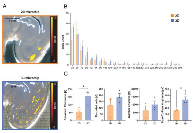 圖 5. 3D高分辨微電極陣列(HD-MEA)相對于平面 HD-MEA 在皮層-海馬切片中的記錄能力。A)皮層-海馬切片的圖像,疊加了由 HD-MEA 電極在 3 分鐘內檢測到的相應電活動圖(顏色刻度條:0 - 50 個Spike)。上:切片放置在平面 HD-MEA 芯片上;下:切片放置在 3D HD-MEA 芯片上。B)平面和 3D HD-MEA 芯片中按細胞計數分布的Spike數量。C)直方圖顯示平面和 3D HD-MEA 芯片記錄的平均活躍電極數量、平均活躍細胞數量、平均總Spike數量以及Spike的峰峰值幅度。在 B 和 C 中,直方圖報告平均值±標準誤,星號表示顯著差異(* p < 0.05)。
