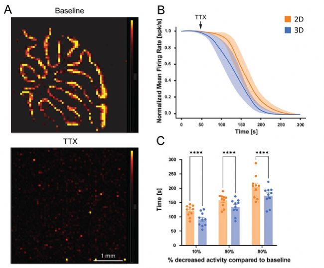 圖6. 3D 高分辨微電極陣列(HD-MEA)與平面 HD-MEA 相比藥物作用加速。為測試藥物灌流的效果,將河豚毒素(TTX)應用于急性小腦切片。A)電活動圖示例,顯示在 3D 芯片上放置的切片在應用 TTX 前(上)和應用后(下)的活躍電極分布情況(顏色刻度條:0 – 300uV)。B)該圖展示了在平面和 3D HD-MEA 上放置的小腦切片在 TTX灌流后活躍單元平均放電率(MFR)的歸一化時間進程。平均放電率歸一化為 TTX 應用前 1 分鐘的基線活動。C)直方圖顯示了兩種條件下 TTX 應用后達到放電頻率降低 10%、50% 或 90% 所需的時間。直方圖報告了平均值 ± 標準誤,星號表示顯著差異,* p < 0.05,** p < 0. 01,*** p < 0.001。