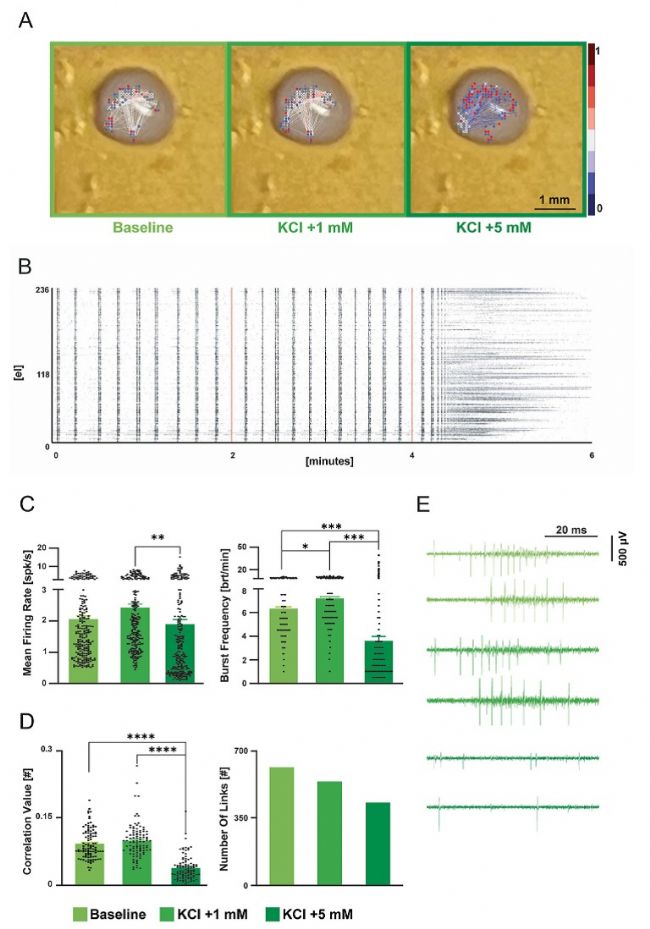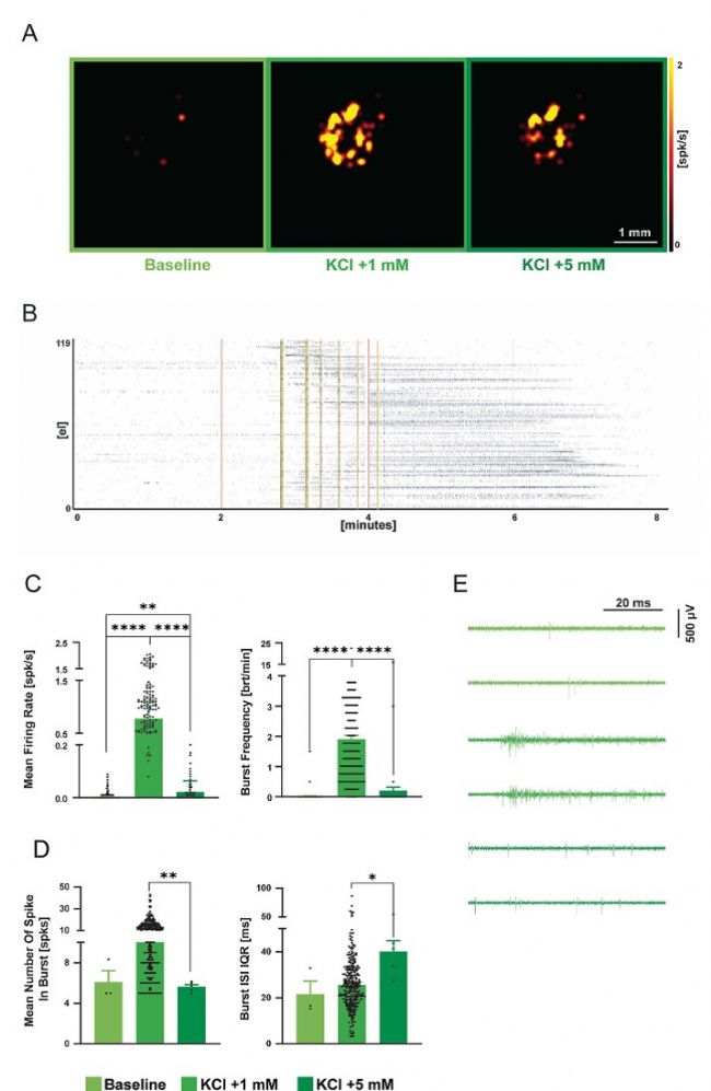 圖 11. 利用 3D 高分辨電極陣列記錄人類脊髓類器官的電活動。A)尖峰圖,顯示了在三種測試條件下芯片上每個電極的平均放電率(從左至右:基線、+ 1 mM、+ 5 mM KCl)。B)柵格圖,顯示了每個實驗條件下的活動模式隨時間的變化。黑色點表示檢測到的Spike。紅色線表示培養基中鉀離子濃度的變化;黃色突出顯示了爆發。C)直方圖顯示了放電和爆發的指標,用于確定活動和網絡同步性。D)提高 KCl 濃度導致1 毫摩爾的氯化鉀(KCl)導致爆發中Spike數量增加,但這種增加并不顯著。相反,更高的氯化鉀濃度(+5 毫摩爾)使爆發中的Spike數量恢復到基線水平(p < 0.0001,n = 230),并增加了爆發Spike間隔的不規則性(p < 0.05,n = 230)。誤差線表示標準誤差。 E)每個記錄階段的代表性軌跡顯示了脈沖活動的調節情況。星號表示顯著差異,* p < 0.05,** p < 0.01,**** p < 0.0001。