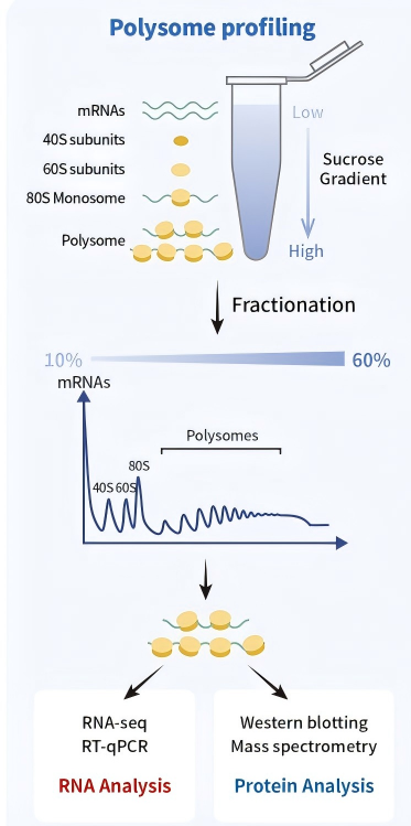 Polysome profiling下游產物可進行多種檢測:高通量測序分析全局翻譯狀態;RT-qPCR驗證不同條件下特定基因的翻譯狀態;WB/質譜驗證翻譯活性,還可分析翻譯調控因子的功能。