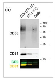 研究人員用MCF細胞做了實驗,分析了它們在EVs中的相對富集,即它們在EVs中相對于其細胞表達水平的比例。CD63的富集度比CD9低3倍,CD81的富集度平均比CD9高約2倍。與CD63相比,CD9和CD81主要定位在質膜上,細胞內定位很少。