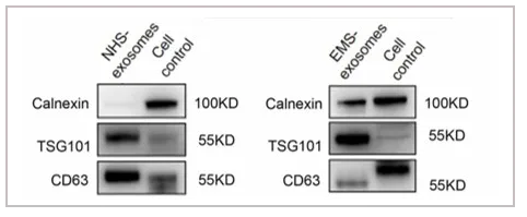 WB結果顯示,外泌體標記蛋白CD63和TSGl01在EMS(子宮內膜異位癥)外泌體和NHS(正常人樣本)外泌體中均大量表達。在NHS外泌體中未檢測到陰性標記蛋白Calnexin。在EMS外泌體中檢測到少量Calnexin。而我們可以看到,CD63在不同樣本中條帶位置也有細微的差異。