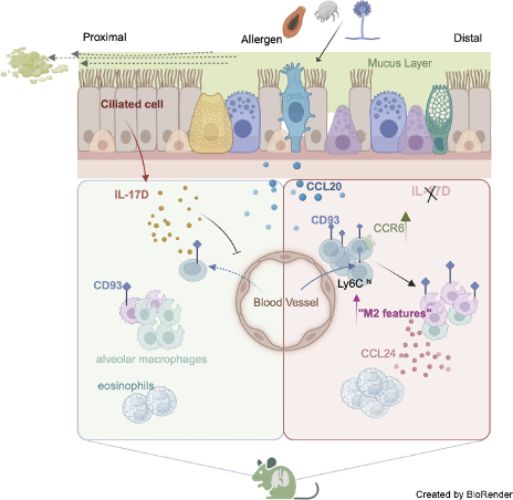 氣道上皮在維持肺環境穩態中發揮著關鍵作用,其失調常常與包括哮喘在內的多種肺部疾病相關。哺乳動物的氣道上皮中存在大量的纖毛細胞,且在清除吸入的顆粒物和病原體方面發揮著關鍵作用。本研究揭示了呼吸道中纖毛細胞(ciliated cells)通過組成性表達(constitutive expression)IL-17D(白細胞介素-17D),結合單核細胞表面受體CD93抑制經典單核細胞(classical monocytes, CL Mono)向肺部聚集,從而限制過敏性哮喘(allergic asthma)中的2型炎癥(type 2 inflammation)。研究結合遺傳學模型(如Il17d和Cd93基因敲除小鼠)、細胞轉移實驗和單細胞RNA測序(scRNA-seq),闡明了IL-17D/CD93軸通過下調單核細胞趨化因子受體CCR6表達,減少其向肺部的遷移及后續分化為致病性肺泡巨噬細胞(alveolar macrophages, AMs)的過程。本研究揭示了纖毛細胞和IL-17D在肺部免疫反應和哮喘中的保護性作用,未來可以進一步探索用于治療相關疾病。