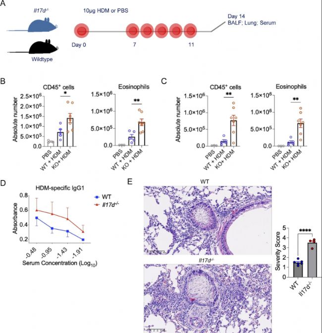 在HDM誘導的過敏性哮喘模型中,Il17d-/-小鼠表現出更嚴重的過敏反應,包括肺部和支氣管肺泡灌洗液(BALF)中CD45+免疫細胞和嗜酸性粒細胞(eosinophils)的顯著增加、血清中HDM特異性IgG1水平升高、肺組織H&E染色顯示血管周圍炎癥加劇、Th2細胞(IL-5+、IL-13+)在引流淋巴結(dLNs)中增多,表明IL-17D抑制2型免疫應答中發揮重要作用。