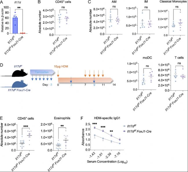 通過條件性敲除Foxj1tm1.1(cre/ERT2/GFP)小鼠中的Il17d,研究者發現,僅在纖毛細胞中敲除Il17d就足以導致HDM誘導的過敏反應加劇,表現為肺內總免疫細胞和嗜酸性粒細胞浸潤增加,血清IgG1升高。證明纖毛細胞是IL-17D的功能性來源。