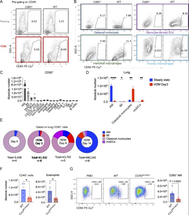 研究發現,CD93主要在肺部的單核細胞和招募的巨噬細胞(包括間質巨噬細胞和肺泡巨噬細胞)中表達。在HDM模型中,CD93的表達不僅在單核細胞上增加,還在其衍生的巨噬細胞上顯著上調。這表明CD93+單核細胞及其衍生細胞在過敏反應中起重要作用。