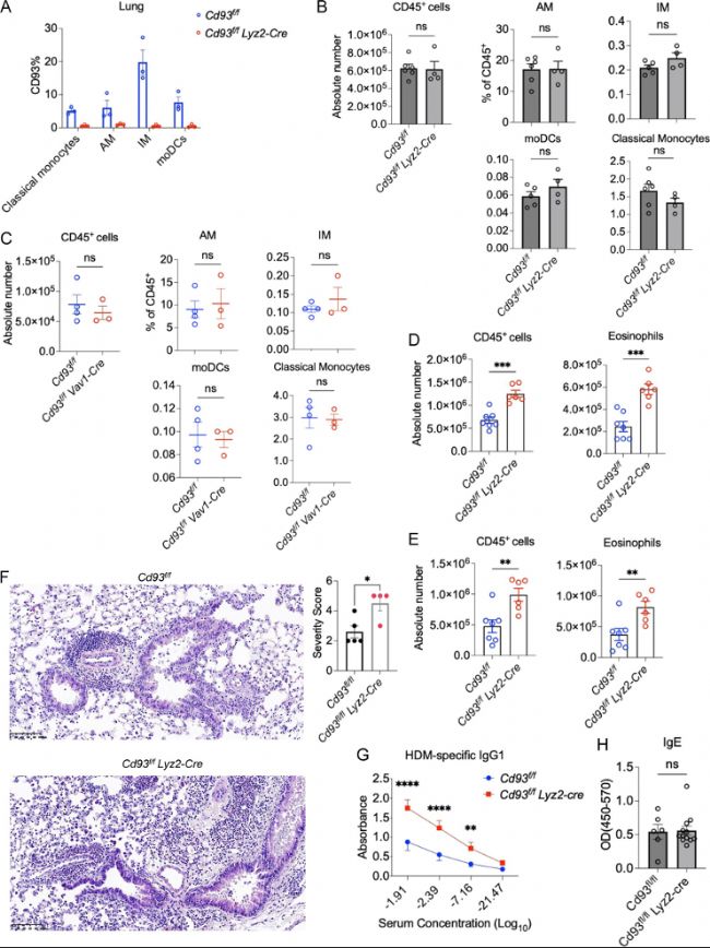 在HDM模型中,Cd93條件性敲除小鼠(Cd93f/f×Lyz2-Cre)表現出更嚴重的過敏反應,包括肺部和BALF中免疫細胞浸潤增加,以及血清中HDM特異性IgG1水平升高。這表明CD93在單核細胞和巨噬細胞中對過敏性哮喘具有保護作用。