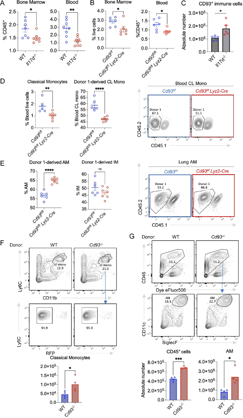 混合骨髓移植實驗:研究IL-17D/CD93軸對單核細胞遷移的影響,驗證CD93的細胞自主性作用。