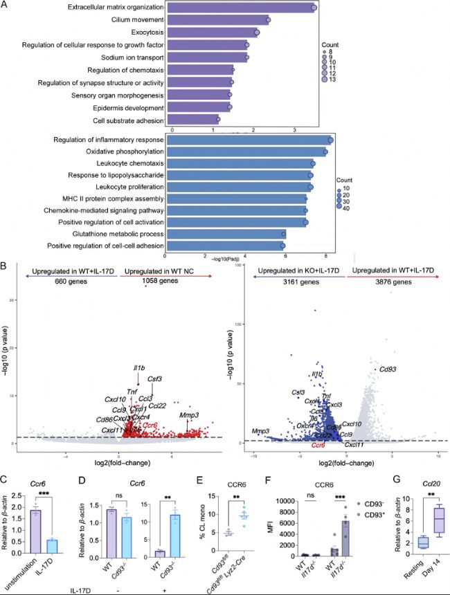 RNA測序(Smart-seq2):對WT和Cd93-/-單核細胞進行RNA測序(scRNA-seq),分析IL-17D調控的基因通路,發現CCR6等遷移相關基因下調。
