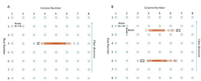 圖3. 仿真電極矩陣由8列(平行于肌纖維方向)和8行的網格組成。(A) 單個IZ位于第4行。(B)兩個IZ分別位于第2行和第3行之間以及第6行