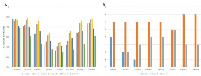 圖7. (A)所有8列(對于雙IZ仿真,沒有MU同步)的相鄰信道信號之間相關系數的例子,(B)對于每一列,在所有十次重復中相關系數最小的相鄰行對的計數
