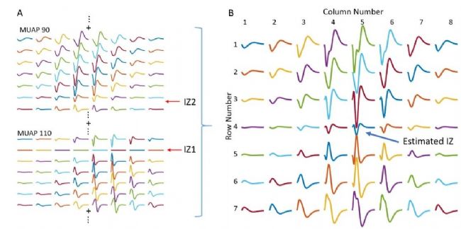 圖9. 從模擬的雙IZ條件下M波中識別出IZ位置的例子。(A)差分MUAPs的分布。模擬的兩個IZ分別位于第2行和第6行與第7行之間。(B)所有MUAP求和產生的M波