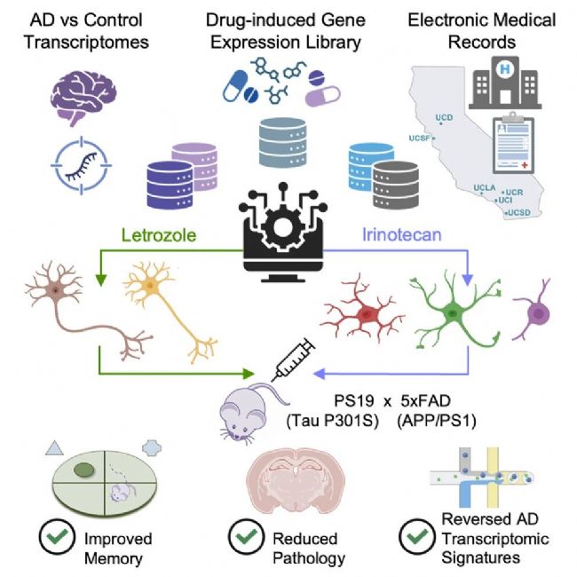 通過整合單細胞轉錄組學、藥物擾動數據庫和臨床記錄,研究團隊發現來曲唑和伊立替康可作為阿爾茨海默病的潛在聯合療法。在同時具有Aβ和tau沉積的AD小鼠模型中,該聯合治療較單藥治療顯著改善記憶功能并減輕病理改變。單核轉錄組分析證實,治療以細胞特異性方式逆轉了疾病相關基因網絡。