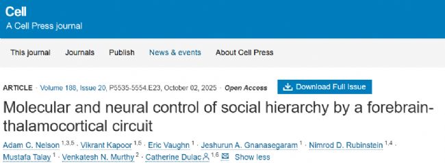 2025年8月11日,美國學者在Cell期刊上發表了題名為“Molecular and neural control of social hierarchy by a forebrain-thalamocortical circuit”的研究論文,本研究揭示了前腦-丘腦-皮層神經環路調控社會等級的可塑性機制。