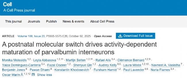 2025年7月15日,英國、丹麥以及西班牙的學者聯合在Cell期刊上發表了題名為“A postnatal molecular switch drives activity-dependent maturation of parvalbumin interneurons”的研究論文,本研究揭示了神經元活動通過PGC-1α分子開關調控小清蛋白陽性(PV+)中間神經元發育成熟的分子機制。
