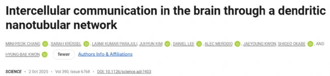 2025年10月2日,美國以及日本的學者聯合在Science期刊上發表了題名為“Intercellular communication in the brain through a dendritic nanotubular network”的研究論文,本研究發現并證實了大腦神經元間存在一種全新的非突觸通信機制——樹突納米管網絡。