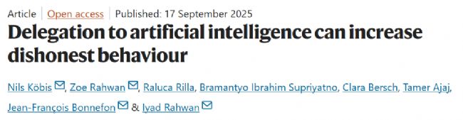 2025年9月17日,德國以及法國的學者聯合在Nature期刊上發表了題名為“Delegation to artificial intelligence can increase dishonest behaviour”的研究論文,本研究通過實驗揭示了人類委托機器代理執行任務時誘發不道德行為的風險。