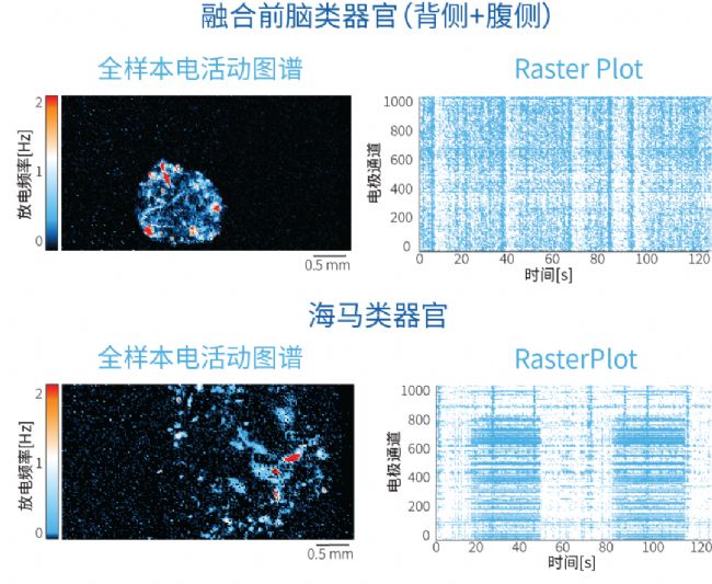 上圖展示了融合前腦類器官(背側 + 腹側)與海馬類器官的全樣本電活動圖和柵格圖,呈現(xiàn)神經(jīng)網(wǎng)絡的動態(tài)放電特征。MaxOne HD-MEA 系統(tǒng)可高效表征不同尺寸的類器官,操作簡便,數(shù)據(jù)質量卓越。