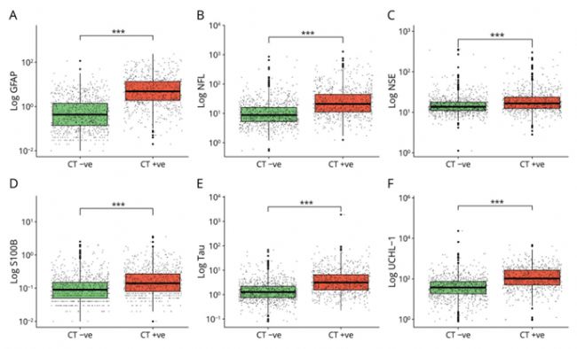 在損傷發(fā)生24小時內(nèi),與CT陰性mTBI相比,CT陽性mTBI參與者的所有生物標(biāo)志物濃度均顯著升高。