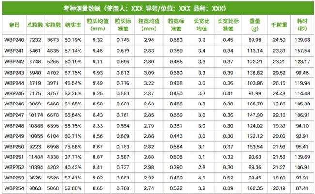 采用線單次測量,同步獲取總粒數(shù)、實粒數(shù)、結(jié)實率、粒長、粒寬、粒面積、粒周長及千粒重等多個關(guān)鍵參數(shù),滿足全方位考種需求。