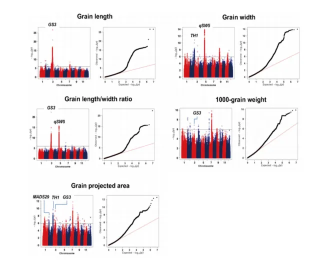 谷粒粒長、粒寬、長寬比、千粒重、投影面積GWAS分析結(jié)果,鑒定出控制粒長的基因位點GS3,控制粒寬的基因位點qsw5,控制粒長寬比的基因位點GS3,控制千粒重的基因位點GS3,控制谷粒投影面積的基因位點有MADS29、TH1、GS3。