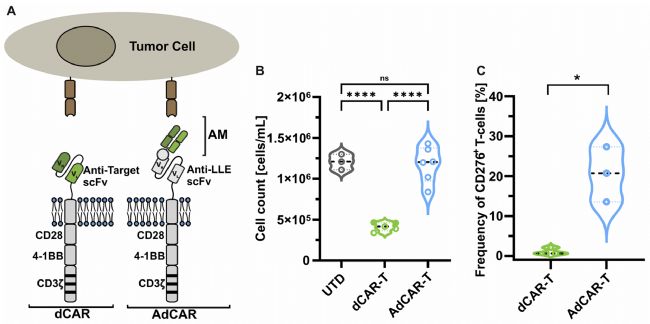 體內給藥時引入 AM,注射 AM 后形成“AdCAR-T + AM”復合物,連接腫瘤細胞并觸發殺傷。