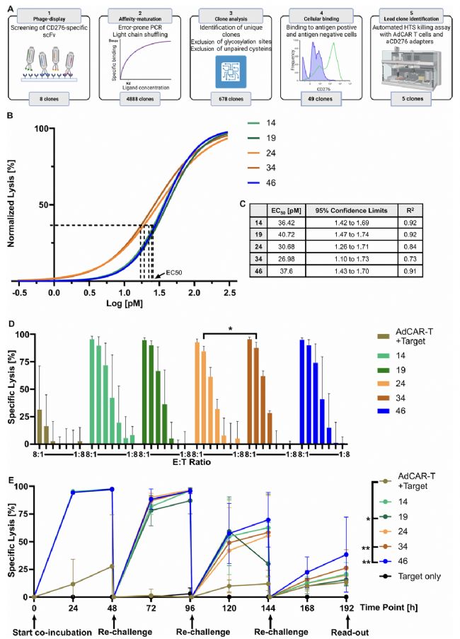 人源 scFv 噬菌體庫 → 親和力成熟 → 5 個先導 Fab-AM(AM14/19/24/34/46)。