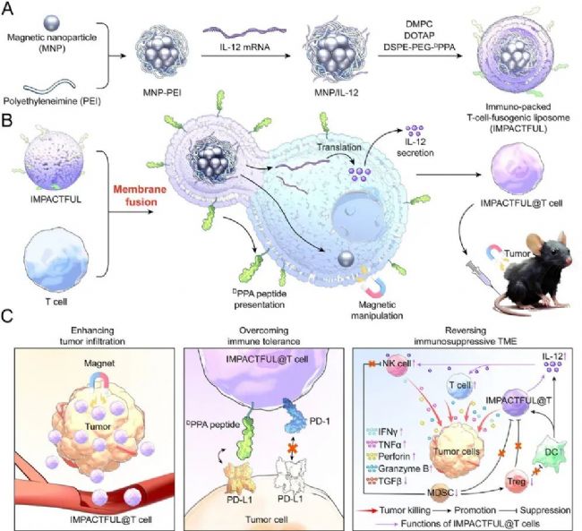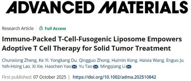 2025 年 10 月 7 日,中山大學李明強、陶玉和吉林大學姚浩琛共同通訊在Advanced Materials在線發表題為“Immuno-Packed T-Cell-Fusogenic Liposome Empowers Adoptive T Cell Therapy for Solid Tumor Treatment”的研究論文。該研究報道了一種一步式細胞工程策略,通過“免疫包裹型T細胞融合脂質體(IMPACTFUL)”增強實體瘤的T細胞治療效果。借助膜融合作用,IMPACTFUL可同時實現兩項功能:一是在治療性T細胞表面修飾DPPA肽,二是將載有白細胞介素-12(IL-12)mRNA的磁性納米顆粒(MNP/IL-12)遞送至T細胞胞質內。