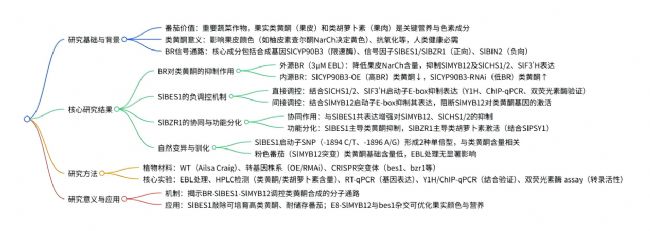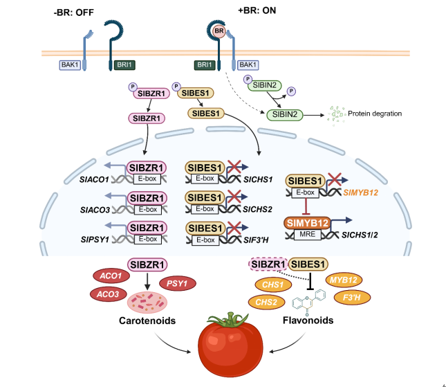 番茄(Solanum lycopersicum)是一種重要的蔬菜作物,其果實色澤和營養價值備受關注。果實顏色主要由果肉的類胡蘿卜素和果皮的黃酮類物質共同決定。但由于現代栽培番茄的黃酮含量普遍較低,且兼具植物抗逆(紫外防護、抗生物脅迫)與人類健康益處(抗氧化、抗炎),因此類黃酮被視為評估番茄果皮顏色和營養價值的核心指標。目前雖然已知類黃酮合成通路(以苯丙氨酸為前體,SlCHS為關鍵限速酶,SlMYB12為核心調控因子)及BR信號通路(SlCYP90B3為合成限速基因,SlBES1/SlBZR1為核心轉錄因子),但BR調控番茄類黃酮合成的分子機制仍不清楚。