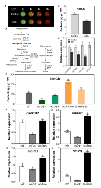 本研究通過外源EBL處理番茄果實,結合高效液相色譜(HPLC)檢測果實表皮類黃酮(以NarCh為指標)含量及實時熒光定量PCR(RT-qPCR)檢測類黃酮相關基因(SlMYB12、SlCHS1、SlCHS2、SlF3'H)表達,結果顯示外源EBL處理能顯著抑制番茄果皮類黃酮的積累。然后進一步構建了BR生物合成限速酶基因SlCYP90B3的過表達和RNA干擾系進行驗證,結果表明內源BR通過SlCYP90B3負調控類黃酮合成。
