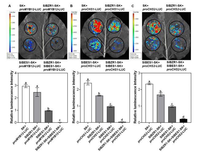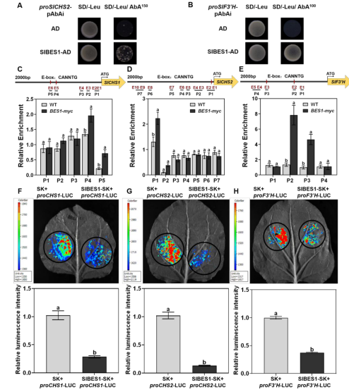 圖3:SlBES1直接結合并抑制proSlCHS1、proSlCHS2和proSlF3’H的表達