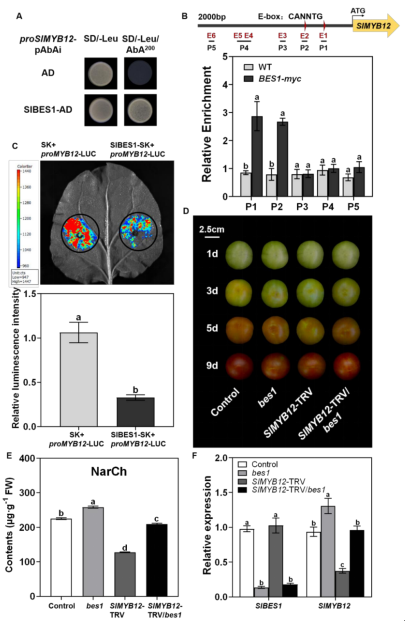圖4:SlBES1通過SlMYB12層級轉錄調控類黃酮生物合成